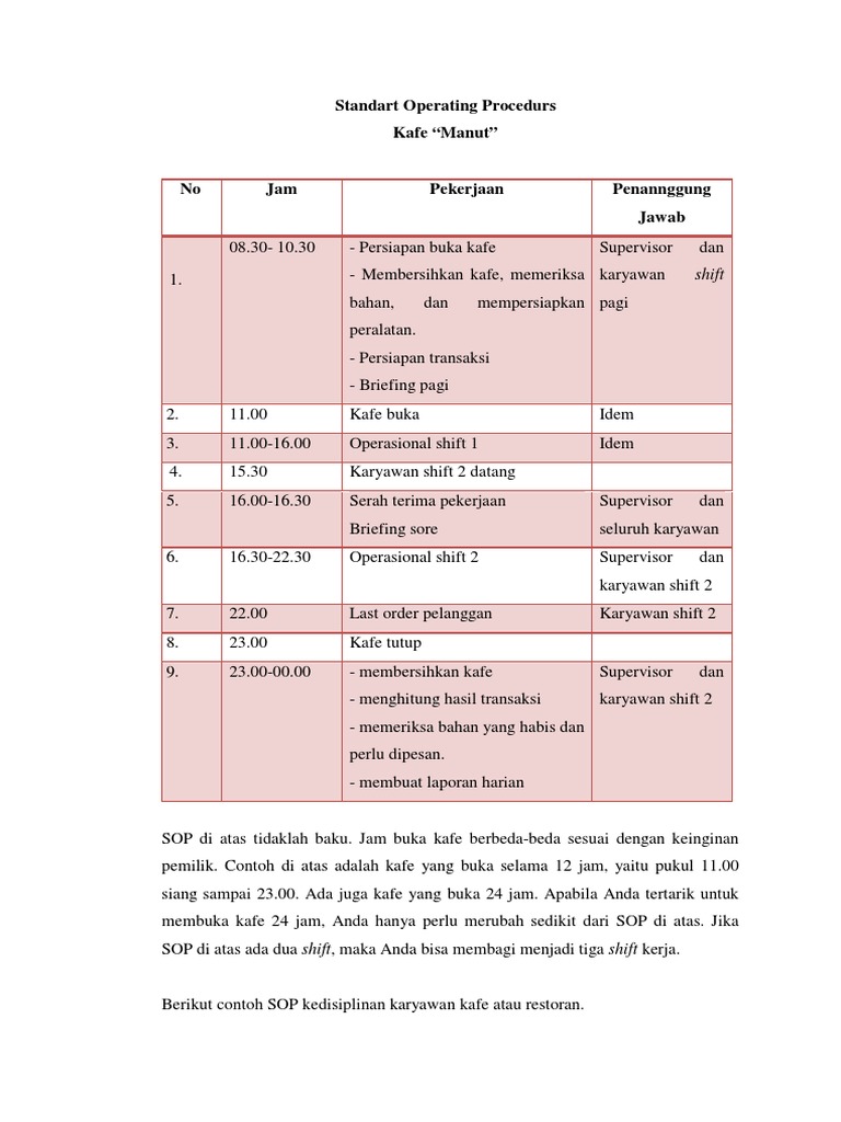 Untuk evaluasi kinerja restoran anda - FORM Penilaian Kinerja Karyawan - Etika Kerja Restoran - Ebook Job Desk karyawan restoran - Penyusunan Menu - Manual Pengajuan Sertifikasi Halal MUI - Hand Out Peralatan. Itulah pembahasan singkat mengenai pengertian SOP tujuan SOP manfaat SOP cara membuat SOP yang baik dan benar dan contoh SOP perusahaan contoh SOP kerja contoh SOP paud. Biasanya hal tersebut kita kenal dengan SOP Standar Operasional Prosedur dan tentu setiap bisnis punya standar.